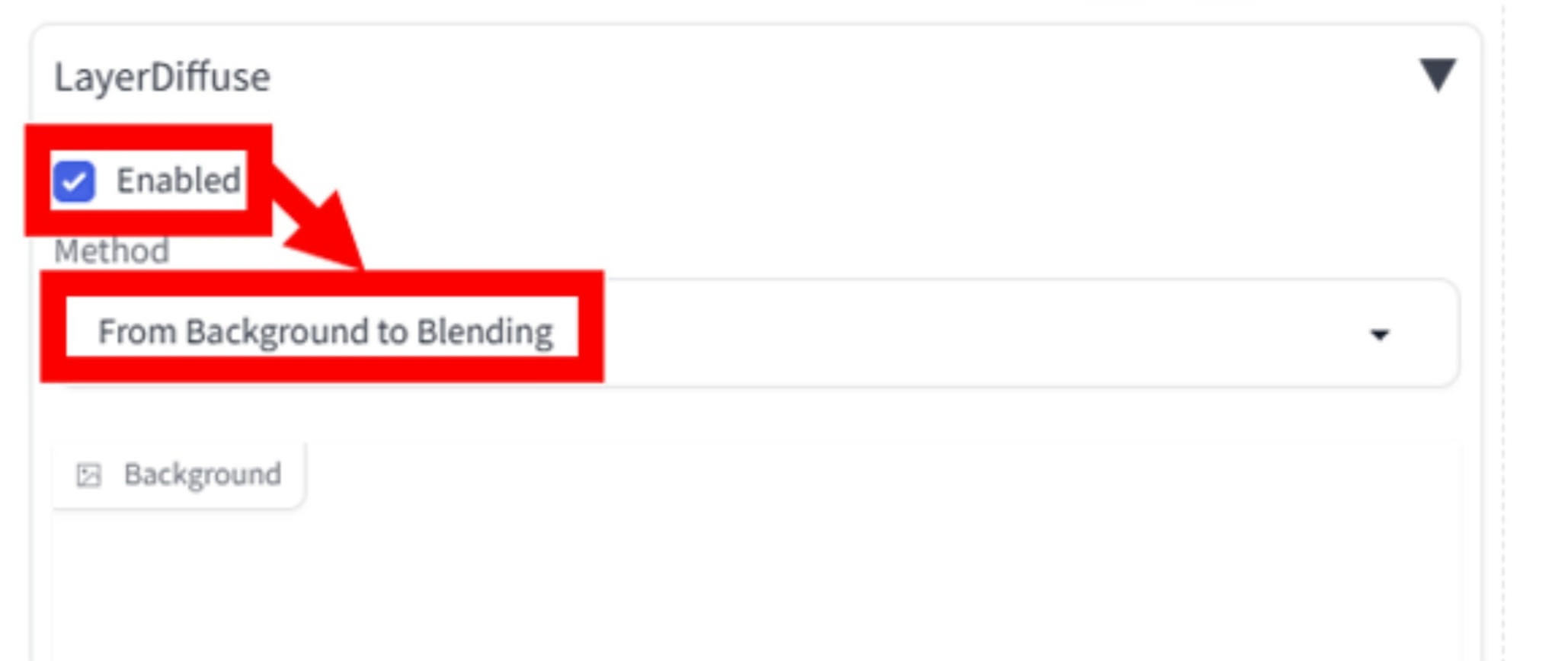 배경을 따라 포즈의 이미지를 생성하는 절차는 다음과 같습니다. 먼저 LayerDiffuse 메뉴에서 Enable을 선택하고 Method 열에서 From Background to Blending을 선택합니다.