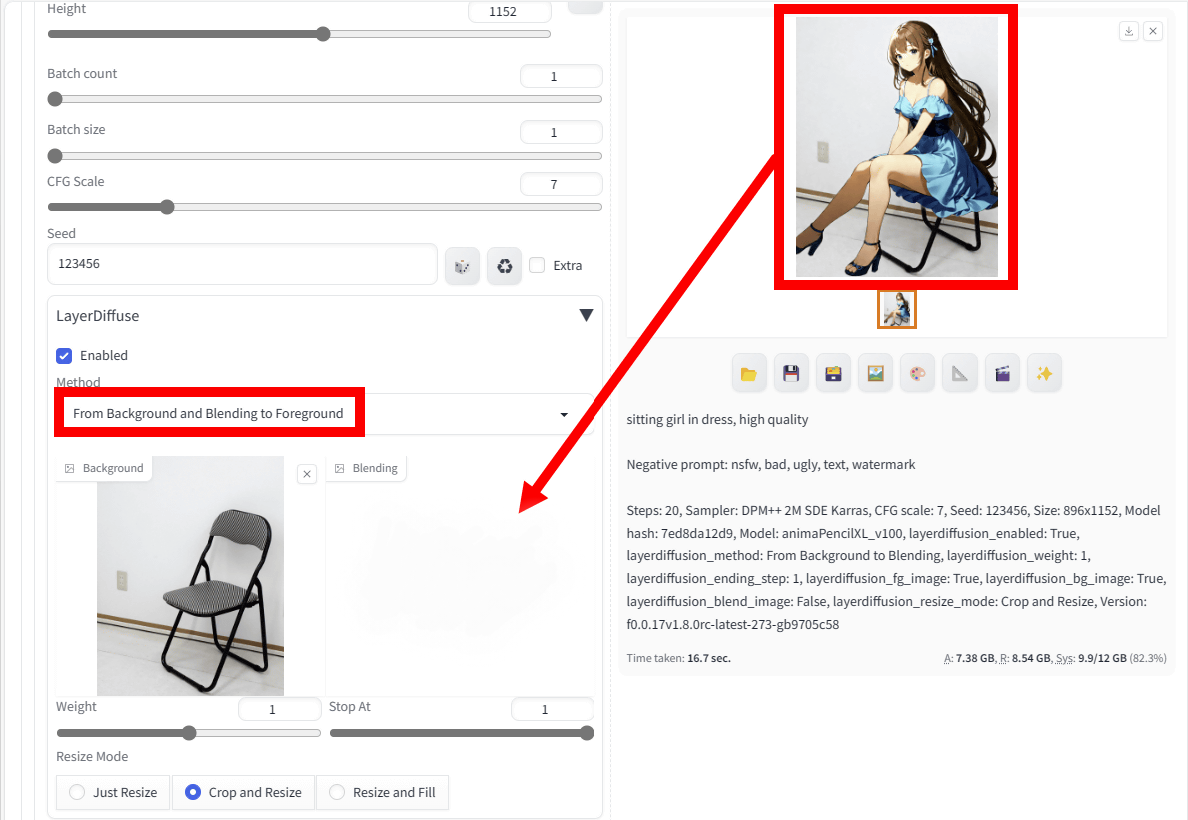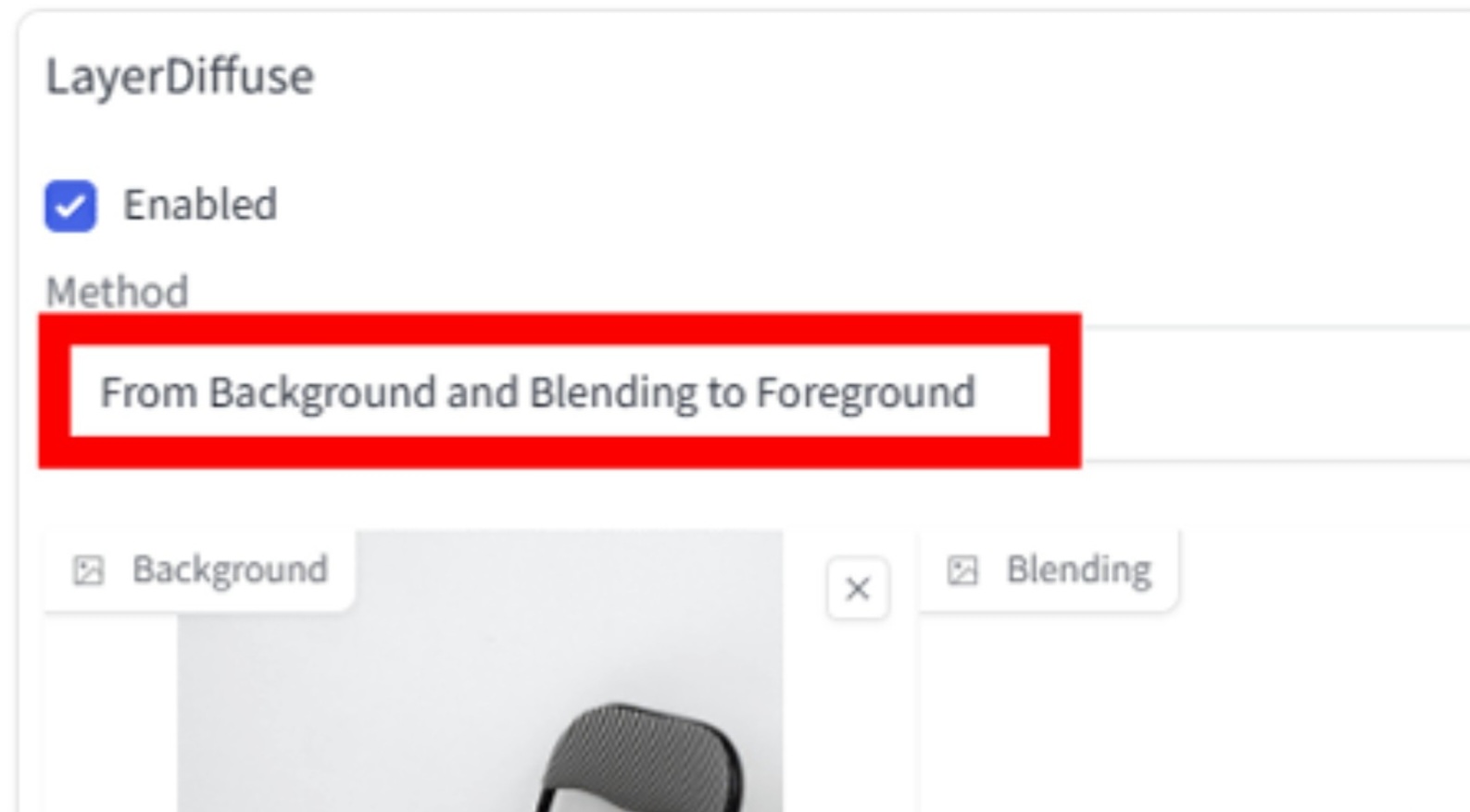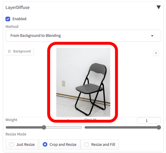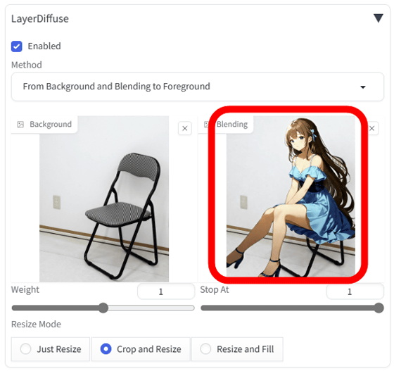 그런 다음 배경을 삭제하는 작업을 진행합니다. 우선, 「LayerDiffuse」의 메뉴 내의 Method란에서 「From Background and Blending to Foreground」를 선택.