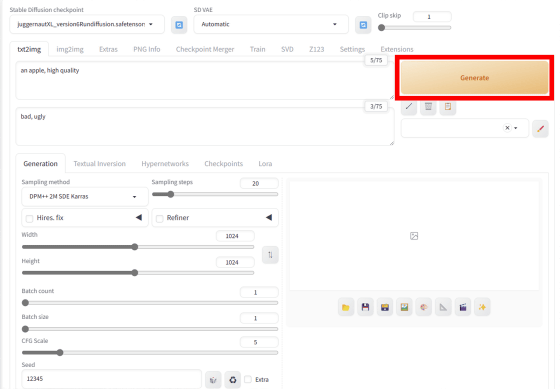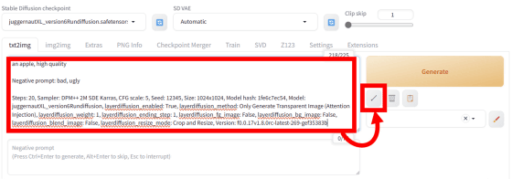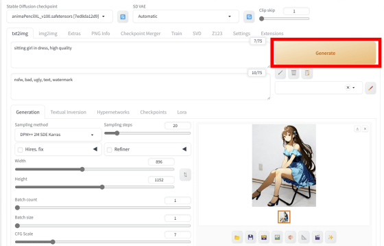 그러면 프롬프트, 샘플러, 스텝 수, 해상도 등의 설정이 자동으로 조정됩니다. 그 후 "Generate"를 클릭하여 이미지 생성을 시작합니다.