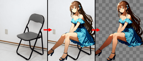 Layer Diffusion에서는 통상의 이미지 생성과 같이「앉은 포즈의 인물」, 「잠자는 개」등 포즈를 지정해 투과 이미지를 생성할 수 있습니다. 이때,「배경이 될 이미지」를 지정하는 것으로, 배경에 따른 포즈를 취한 상태에서 배경을 투과하는 것이 가능합니다. 예를 들어, 아래의 예에서는 의자 사진을 배경으로 입력하고 "앉은 여성"을 생성하여 의자에 앉히고 그다음 의자와 배경을 삭제하고 있습니다.