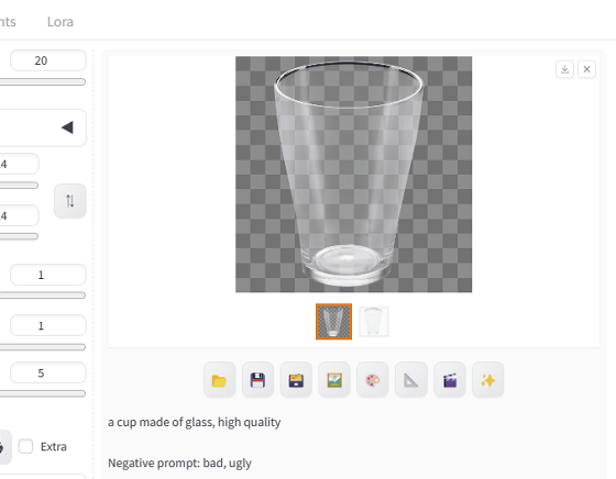 Layer Diffusion에서는 "배경이 완전히 투명한 이미지"뿐만 아니라 "다른 투명도가 공존하는 이미지"도 만들 수 있습니다. 예를 들어 모델 데이터에 "Juggernaut XL V6"을 사용하여 다음 설정으로 투명한 유리 이미지를 생성해 봅니다.