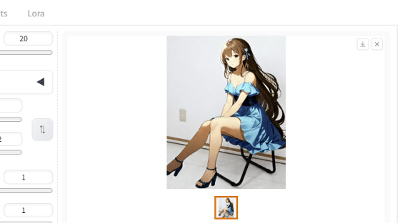 그런 다음 일반 이미지 생성과 마찬가지로 모델 데이터를 선택하거나 프롬프트를 입력한 다음 이미지를 생성합니다. 이번에는 애니메이션 일러스트 스타일의 묘사로 의자에 앉아있는 소녀의 투명 이미지를 생성하기 위해, 모델 데이터는 "anima_pencil-XL 1.0.0"을 사용하고, 그 외의 설정은 아래와 같이 하여 이미지를 생성했습니다.