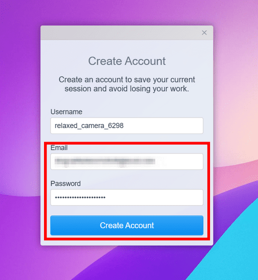 "Username"에는 미리 무작위 사용자 이름이 할당되어 있으므로 변경하지 않으셔도 됩니다. 그런 다음 이메일 주소와 비밀번호를 설정하고 [Create Account]를 클릭합니다. 그러면, 입력한 메일 주소에 인증용 메일이 와 있으므로, 그 메일에 있는 링크를 클릭하면 계정 작성이 완료됩니다.