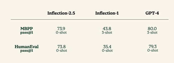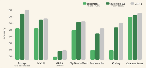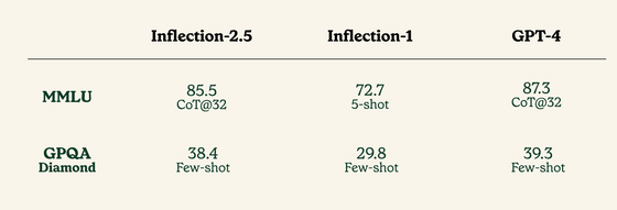 Pi의 인기를 지지하고 있는 것이, Pi에 탑재되고 있는 기반 모델인 Inflection-2.5입니다. Inflection-2.5는 트레이닝에 소비된 컴퓨팅량이 GPT-4의 40%, 이전 모델인 Inflection-1에 이르러서는 GPT-4의 4%밖에 안되는데도 멀티태스킹 성능을 측정하는 MMLU(Massive Multi-task Language Understanding)나 대학원 수준의 지식을 요구하는 Google의 벤치마크 GPQA(Baselines and analysis for the Google-proof Q&A)의 최고 수준 데이터 세트 Diamond에서 GPT- 4에 필적하는 점수를 보여주었습니다.