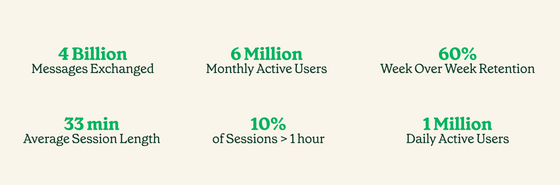 Inflection에 의하면, Pi는 데일리 액티브 유저수 100만 명, 월간 액티브 유저수 400만 명이 이용하고 있다고 합니다. 또한, 평균 대화 시간은 33분으로, 10명에 1명은 1시간 이상 말을 걸거나, 사용한 유저의 60%는 다음 주에 또 Pi를 사용하고 있다고 하며, 이용자의 만족도 지표에서 경쟁 서비스보다 높은 점수를 내고 있습니다.