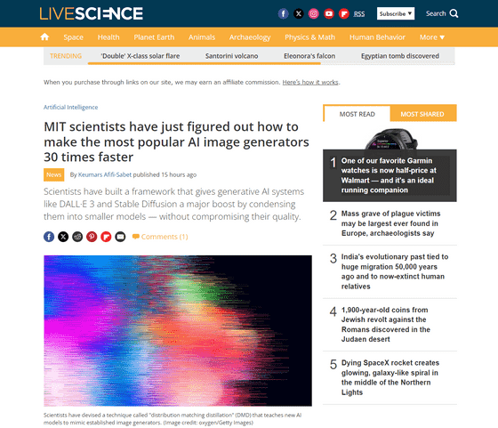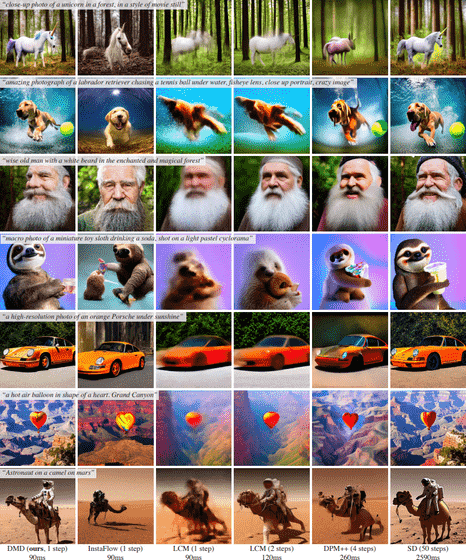 이번 MIT의 연구팀이 발표한 '분포 매칭 증류(DMD : Distribution Matching Distillation)'라는 기법에서는 이 「 역확산 」 단계를 1단계까지 줄임으로써 이미지 생성에 걸리는 시간을 크게 단축하는 데 성공했습니다.
