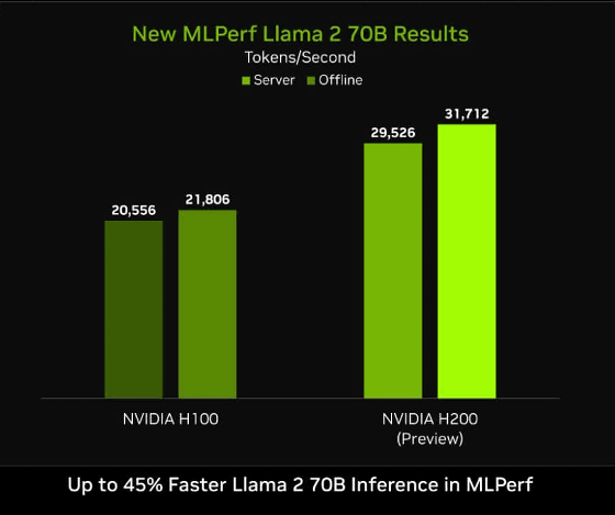 MLPerf Inference v4.0의 Lama 2 70B 벤치마크 결과를 H100과 H200으로 비교한 그래프가 아래입니다. H200이 최대 45% 뛰어난 성능을 발휘한다는 것을 알 수 있습니다. MLPerf Inference를 사용하면 이런 느낌으로 다른 하드웨어의 AI 처리 성능을 알기 쉽게 비교할 수 있다는 것입니다.