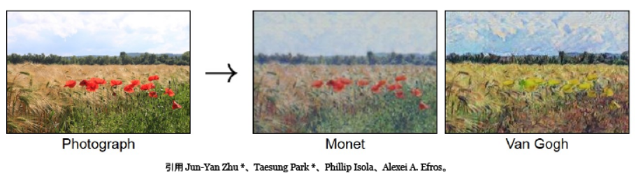 여기에서 다시 생성 모델을 돌아봅시다. 아무것도 없으면 이미지가 생성되기 어렵기 때문에, 이미지에서 이미지를 생성하는 이미지 변환을 소재로 합니다. 그림 4는 모네의 화풍을 흉내 내는 훈련을 한 형이 사진을 바탕으로 모네의 터치로 그림을 생성한 예입니다. 이웃집 고흐와 비교하면 대단히 모네 같네요. 언어 번역의 사진판이라는 것으로, 화상 번역이라고도 하는 기술입니다.