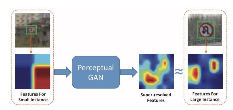 Perceptual GAN은 작은 물체를 감지하기 위해 제안된 방법입니다. 물체 감지에서 큰 물체와 작은 물체의 특징맵이 크게 달라서, 작은 물체를 감지하기 어렵다고 지적하고 있습니다. 아래의 그림은 Perceptual GAN의 개요입니다.