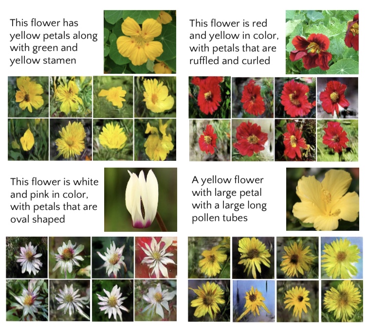 자연 언어를 입력으로 하여, 해당 언어를 반영한 이미지 생성이 Conditional GAN의 틀에서 이루어지고 있습니다.