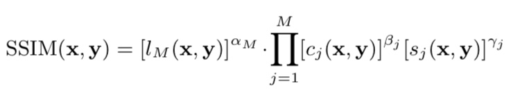 여기에서 y는 각각 비교하고싶은 이미지, l(x,y)는 이미지 사이의 픽셀 값의 변화, c(x,y)는 이미지 사이의 콘트라스트의 변화, s(x,y)는 이미지 사이의 상관 계수를 나타냅니다.