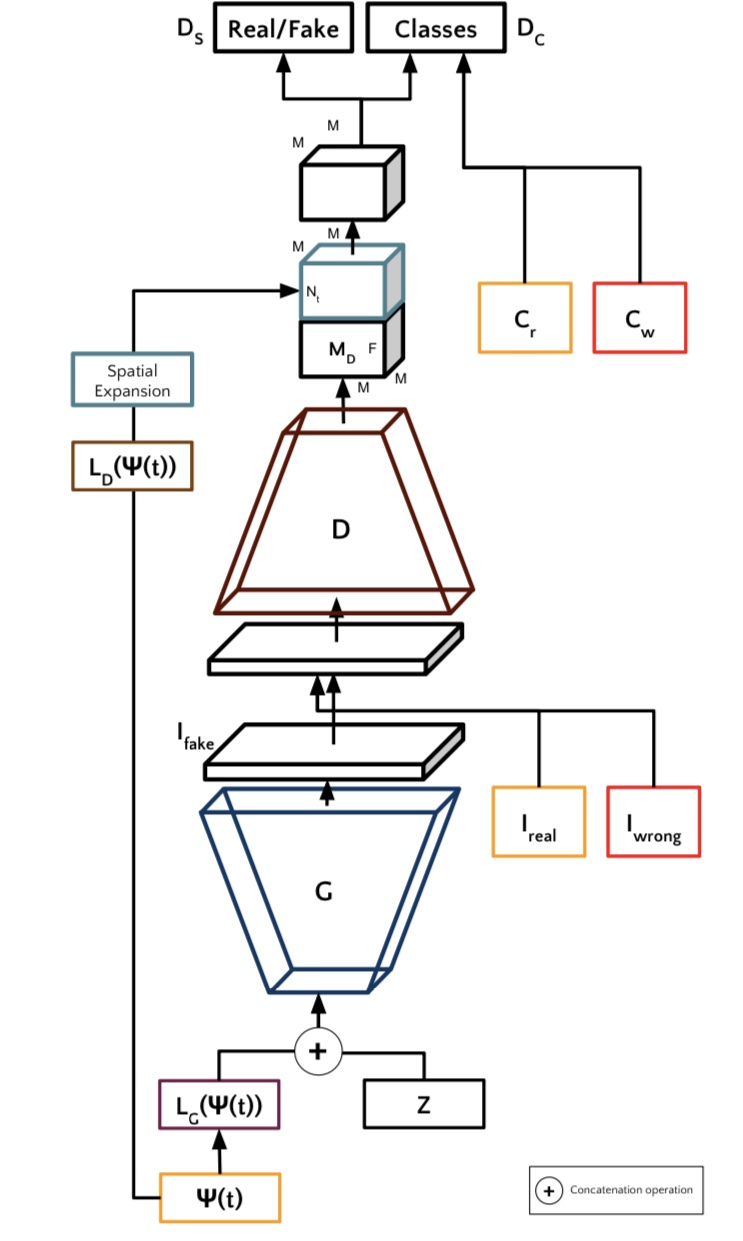 TAC-GAN은 진짜 이미지 Ireal에게 부여된 자연 언어 t를 잠재적 변수에 심어서, 그것과 노이즈 z를 합친 것을 G에 입력합니다. 아래의 그림은 TAC-GAN의 개요입니다.