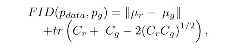IS는 실제 이미지를 고려하지 않는다는 단점이 있습니다. 그것을 개선하기 위해 고안된 지표가 FID입니다. FID는 분류 모델에 따라 실제 이미지와 생성 이미지에서 특징량을 추출합니다. 그들이 정규 분포를 따른다고 가정하고 그 분포 사이의 거리를 측정합니다. 정의식은 다음과 같습니다.