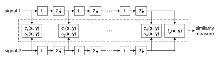 이름에도 있듯이 MS-SSIM은 이미지 사이의 변화를 다른 스케일로 측정하는 지표입니다. 즉, MS-SSIM는 이미지를 흐리게하고 있고, 각각의 스케일 j의 이미지에 대하여 를 계산합니다. 또한, 스케일 M의 이미지에 대해서만 계산합니다. 이것을 나타낸 것이 아래 그림입니다.