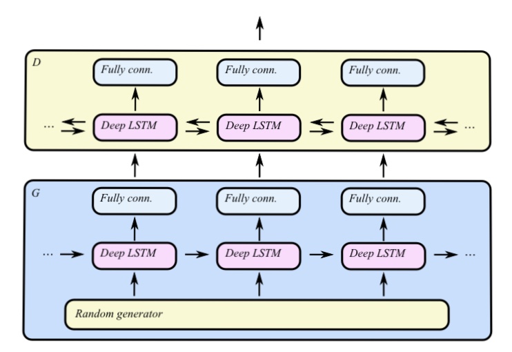 C-RNN-GAN은 음악 생성에 GAN을 적용한 연구입니다. 아래의 그림은 C-RNN-GAN의 개요를 나타낸 그림입니다.