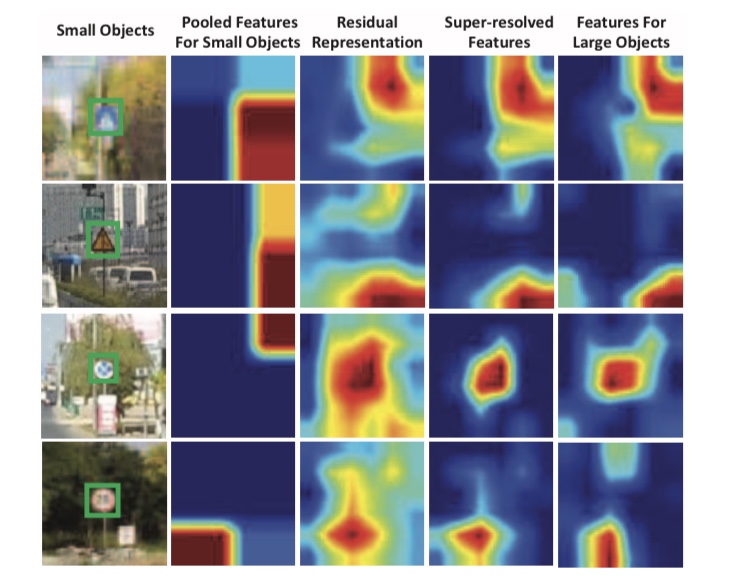 Perceptual GAN은 작은 물체의 특징맵을 큰 물체의 특징맵에 가깝게 하는 G와, 큰 물체의 특징맵인지, 작은 물체의 특징맵에서 G에 의해 생성된 특징맵인지 식별하는 D로 구성됩니다. 다음 그림은 G에 의해 작은 물체에서 생성된 특징맵의 예제입니다.