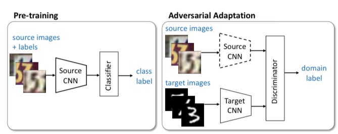 ADDA는 GAN을 도메인 적응에 응용 한 방법입니다. 아래의 그림은 ADDA의 개요 그림입니다.