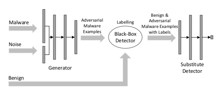 MalGAN은 악성 코드 탐지 시스템을 속이는 악성 코드를 작성하기 위한 GAN입니다. 우선 악성 코드 탐지 시스템의 내부 정보를 알 수 없다고 가정합니다. 이를 블랙박스 공격이라고 합니다. 알 수 있는 것은, 악성 코드 탐지 시스템의 예측 결과뿐입니다. 아래의 그림은 MalGAN의 개요도를 나타낸 것입니다.