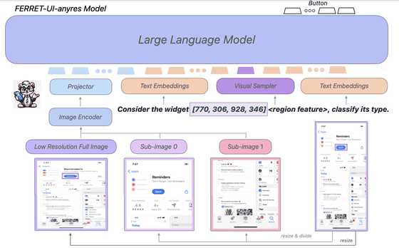 스마트폰의 UI 화면은 보통 세로가 긴 비율을 가지며 아이콘과 텍스트 같은 작은 물체를 포함합니다. 이에 대응하기 위해, Ferret-UI에서는 이미지의 상세를 확대해, 강화된 시각적 특징을 활용하는 「any resolution」 이라는 기술이 도입되었습니다. 이렇게 하면 Ferret-UI가 화면 해상도에 관계없이 UI 세부 정보를 정확하게 인식할 수 있습니다.