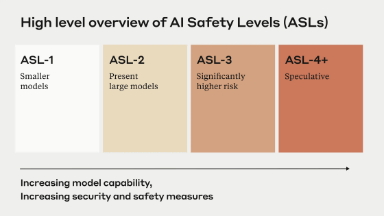 또한 Anthropic은 AI의 성능 향상에 따른 안전 위협을 AI Safety Levels(ASL)라는 지표로 분류하고 있습니다. AI는 이미 "생물 무기 개발 등에 악용되는 징후"를 보이고 있으며, ASL-2로 분류되어 있습니다. Anthropic은 "검색 엔진이나 교과서와 비교하여 치명적인 위험을 초래하는 AI"를 ASL-3, "현재의 AI를 압도하는 성능을 가지고 위험도를 정의할 수 없는 AI"를 ASL-4로 구분하고 있습니다.