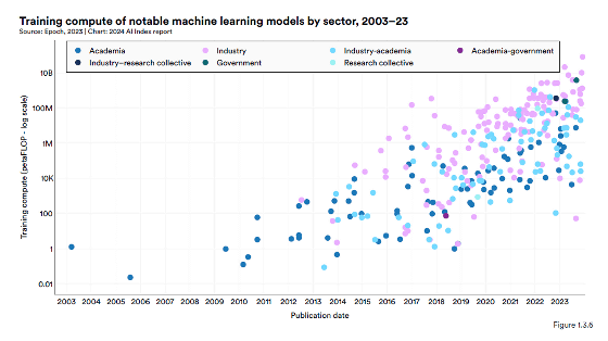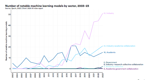 스탠퍼드대학이 정리한 「2023년의 특필해야 할 기계 학습 모델」 중, 기업에 의해 개발된 모델은 51개, 기업과 학술기관이 협력 개발한 모델은 21개, 학술기관이 개발한 모델은 15개였습니다.
