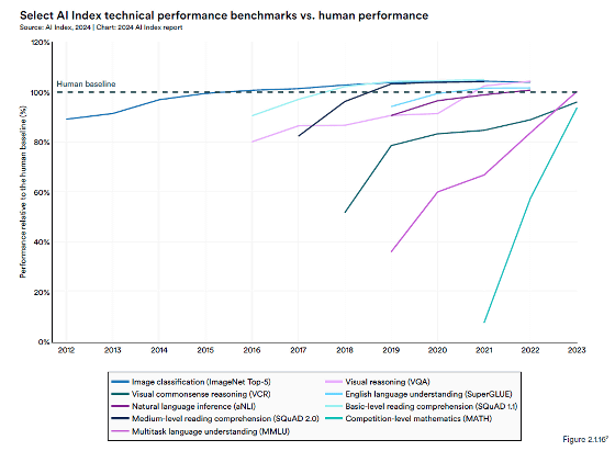 언어 처리 성능이나 화상 처리 성능을 측정하는 9종류의 벤치마크로 인간과 AI의 스코어를 비교한 결과가 아래입니다. 가로축은 측정 연도를 나타내고, 세로축은 인간의 스코어를 100%로 했을 때 AI와 비교하고 있습니다. 또한, 벤치마크는 복수의 AI를 대상으로 실행되고 있으며, 각 벤치마크에서 가장 높은 점수를 기록한 AI의 값이 채용되고 있습니다. 그래프를 보면 단순한 언어 처리나 이미지 인식과 같은 태스크에서는 인간보다 AI가 더 높은 점수를 보여주는 것을 알 수 있습니다. 한편 인간사회의 상식에 근거한 판단 능력이 묻는 시각상식추론(VCR) 벤치마크나 경기레벨 수학(MATH)에서는 인간이 높은 점수를 유지하고 있습니다.