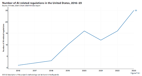 2016년 시점에서는 미국의 AI 관련 규제는 1건뿐이었지만, 2023년에는 25건의 규제가 새롭게 제정되었습니다.