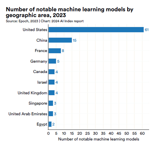 특필해야 할 기계 학습 모델의 개발국은 이런 느낌으로, 미국은 61개 모델을 개발하고, 중국은 15개, 프랑스는 8개, 독일은 5개 모델을 개발하고 있습니다.