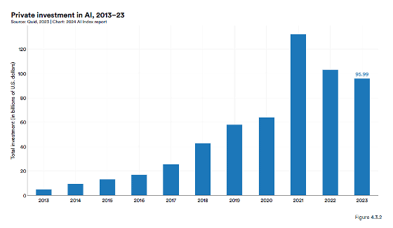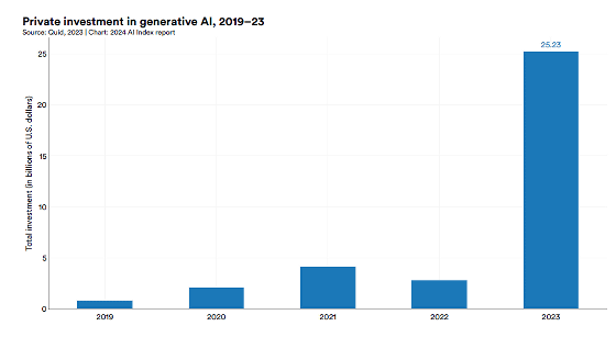 그러나, 생성 AI에 한하여 민간투자 총액은 2023년에 급증해 252억 3000만 달러(약 35조 722억 원)에 달했습니다.