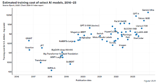 기계 학습 모델의 학습 비용을 정리한 그래프가 아래로, 머신의 성능 향상이나 모델의 복잡화에 따라 학습 비용이 증가하고 있으며, GPT-4의 학습에는 7800만 달러(약 1,083억 원), Gemini Ultra의 학습에는 1억 9100만 달러(2,653억 원)의 비용이 투입되고 있습니다.