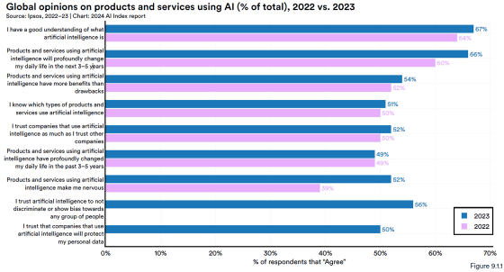 아래는 AI가 스스로에게 미친 영향에 관한 앙케트 결과로, 2023년(파랑)과 2022년(빨강)을 비교한 그래프입니다. "AI에 대해 잘 이해하고 있다"라고 응답한 사람은 2022년 64%에서 2023년 67%로 상승하였고, "AI를 이용한 서비스는 향후 3~5년 만에 내 삶을 변화시킬 것이다."라고 응답한 사람은 2022년의 60%에서 2023년의 66%로 상승했습니다.