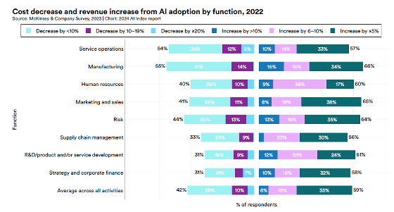 다음 그래프는 여러 기업에 비용과 수익에 대해 물어보고 "AI에 의해 비용이 줄었다고 응답한 비율"과 "AI에 의해 수익이 증가했다고 응답한 비율"을 업종별로 정리한 것입니다. 모든 업종에서 절반 이상의 응답자가 수익이 증가했다고 응답하였고, 서비스업과 제조업에서는 절반 이상의 응답자가 비용이 줄었다고 응답했습니다.