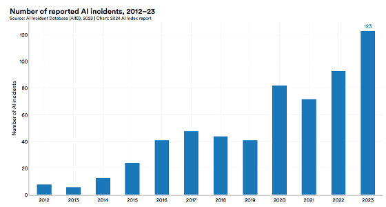 AI는 인간에 대한 위협을 일으킬 수 있으며, 이미 채팅 AI를 악용한 사기나 이미지 생성 AI를 악용한 딥 페이크 확산 등의 사건이 발생했습니다. AI가 원인이 된 사건 발생 건수 그래프를 보면, 건수가 증가하는 경향이 있습니다.