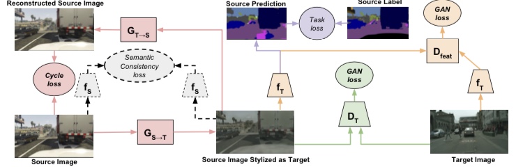 CyCADA라는 기술은 원본 도메인에서 대상 도메인의 변환을 Cycle GAN으로 수행합니다. 이 변환된 데이터와 대상의 특징량 분포는 비슷해야 하므로 ADDA처럼 적대적 학습을 함으로써 분포 사이의 거리를 가깝게 합니다. 아래의 그림은 CyCADA 학습을 나타낸 그림입니다.