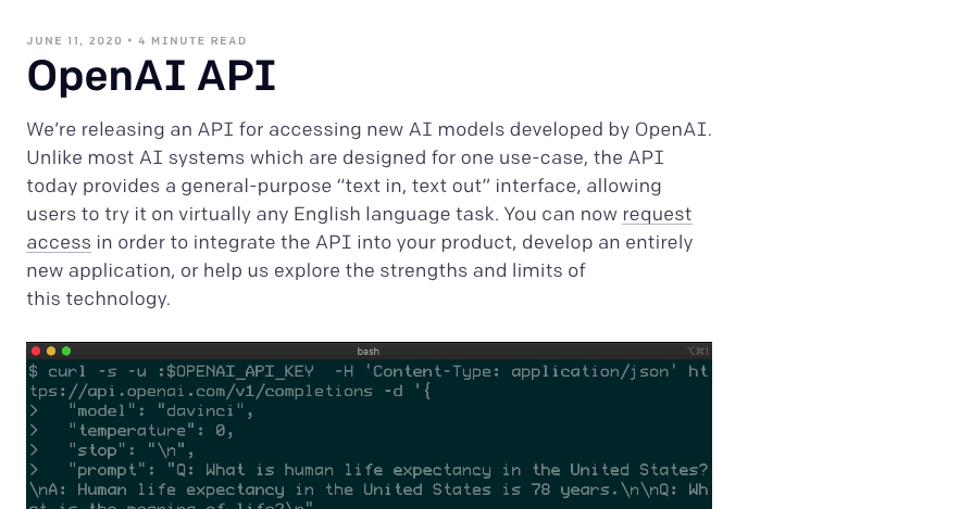 We’re releasing an API for accessing new AI models developed by OpenAI. Unlike most AI systems which are designed for one use-case, the API today provides a general-purpose “text in, text out” interface, allowing users to try it on virtually any Engl