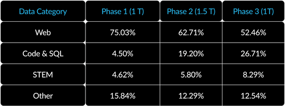 또 트레이닝 시에 페이즈마다 학습 내용을 변경해, 최초의 1조(1T) 토큰분에 해당하는 1단계에서는 상식적인 추론 등 일반적인 스킬을 학습해, 후반의 2단계와 3단계에서 코딩이나 수학 등 복잡한 내용을 학습하도록 하고 있다는 것.