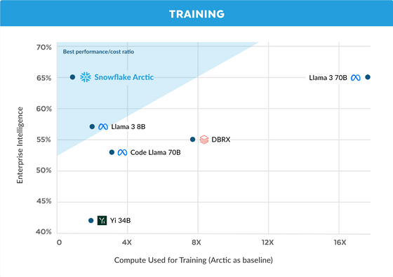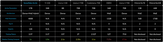 이번 Snowflake가 발표한 LLM인 Snowflake Arctic은 오픈 LLM 중에서도 톱클래스의 엔터프라이즈 인텔리전스 능력을 가진다는 것. 게다가, 트레이닝에 드는 비용은 200만 달러(약 27억 6000만 원) 미만으로, 다른 모델에 비해 매우 효율적으로 트레이닝할 수 있다는 것입니다.