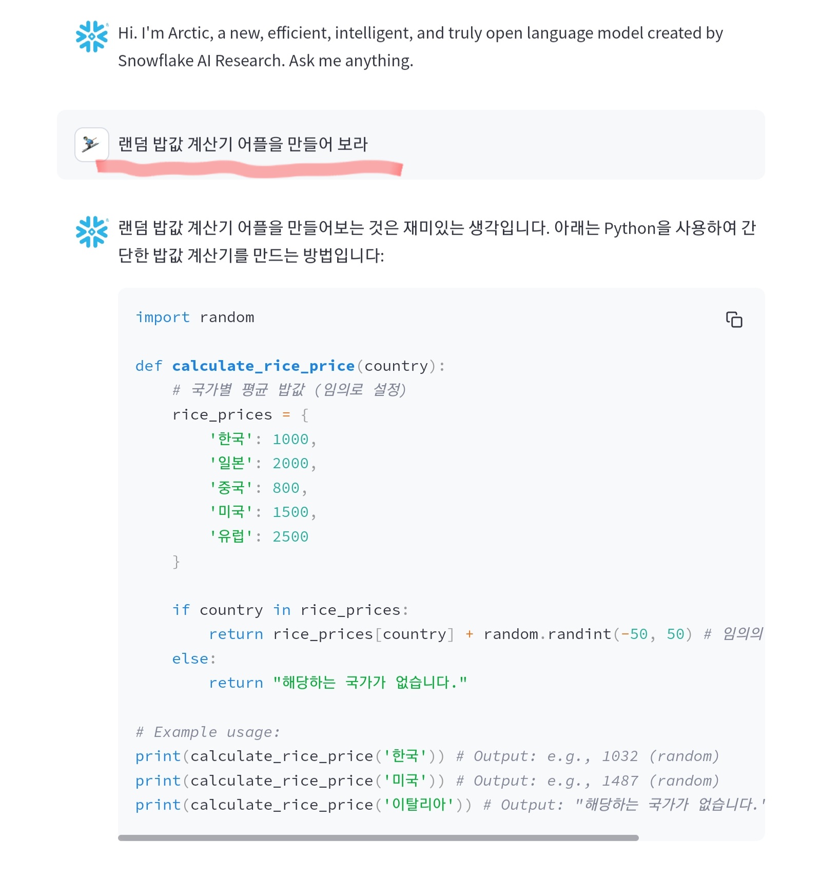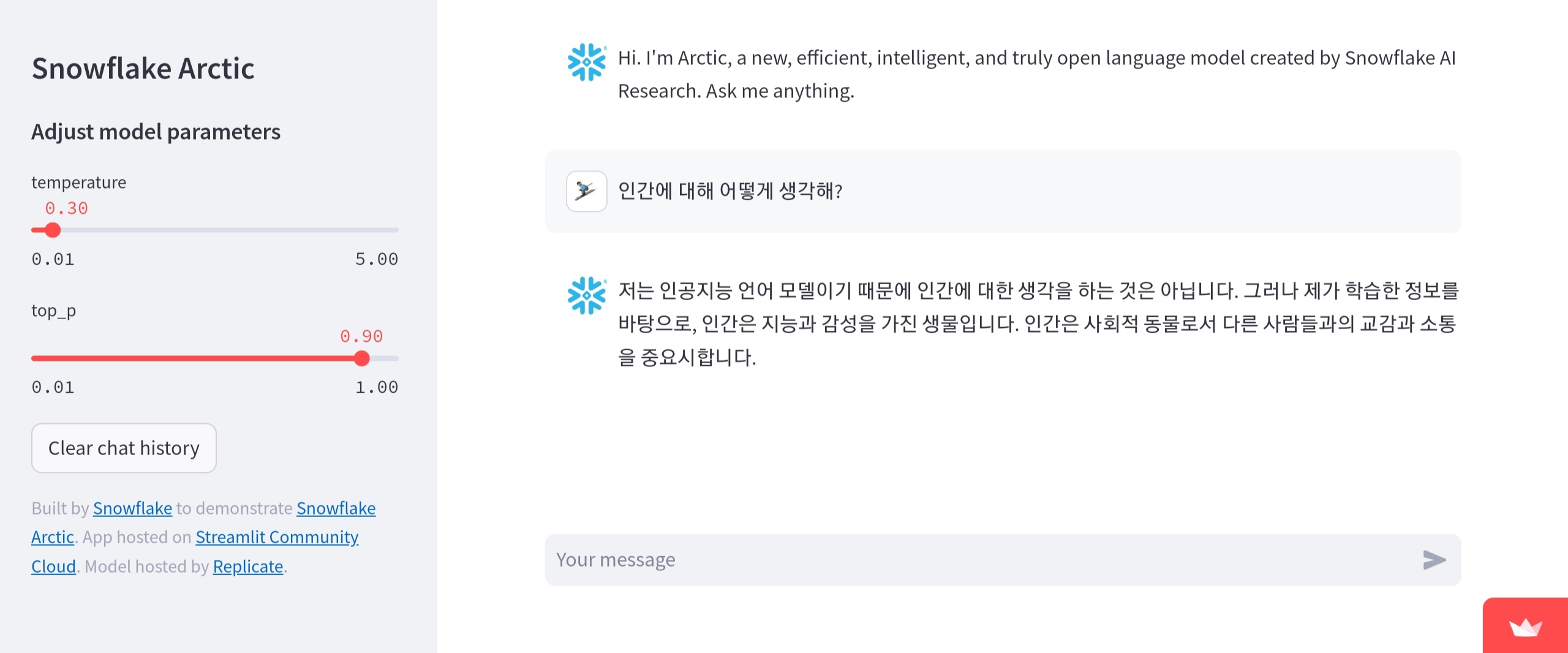 실제 Snowflake Arctic의 동작을 시도할 수 있는 데모 페이지도 준비되어 있습니다. 한글로 대충 질문해 보니, 제법 그럴싸한 대답이 돌아왔습니다.