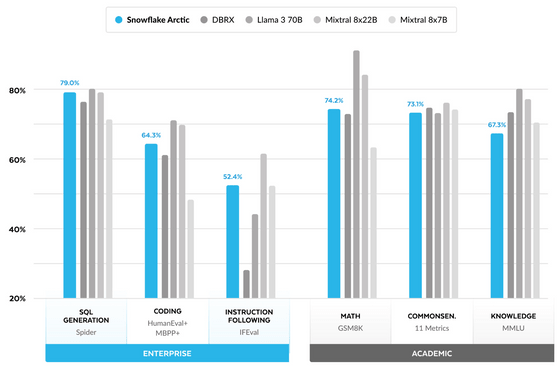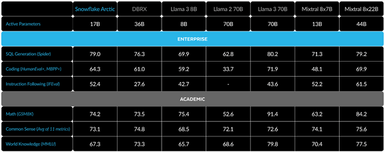 Snowflake Arctic은 'SQL 생성', '코딩', '명령 추종'이라는 엔터프라이즈 인텔리전스에서 Snowflake Arctic을 능가하는 액티브 파라미터를 가진 대형 오픈 모델에 대해서도 최고 수준의 성능을 발휘할 수 있으며, '수학', '상식 적인 추론', '지식' 등 학술 세계에서의 일반적인 지표에서도 같은 사이즈의 모델과 동등한 능력을 발휘할 수 있다는 것.