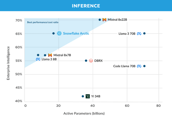 이러한 조정을 거듭함으로써 Snowflake Arctic은 트레이닝뿐만 아니라 추론도 효율적으로 실시할 수 있게 되었습니다. 엔터프라이즈 인텔리전스를 세로축으로, 추론의 효율을 나타내는 지표인 액티브 파라미터 수를 가로축으로 하여 다양한 LLM을 배치하면 아래 그림과 같이 되어, Snowflake Arctic은 적은 계산양으로 높은 퍼포먼스를 발휘합니다.