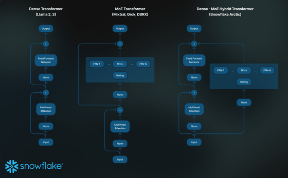 좋은 훈련 효율성을 달성하기 위해 Snowflake Arctic은 독자적인 Dense-MoE 하이브리드 변환기 아키텍처를 사용합니다. MoE는 「Mixture of Experts」 의 약칭으로, Snowflake Arctic에서는 총 128명의 「전문가」 에게 합계 4800억(480B) 파라미터가 나뉘어 있어, 트레이닝과 추론에는 전문가 중에서 총 170억(17B) 매개변수만 사용됩니다.