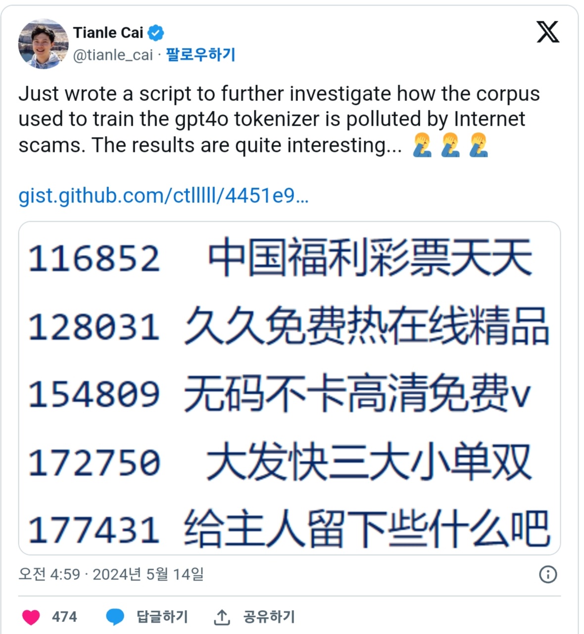 이러한 문제는 관련 페이지를 탈취하는 스팸 사이트가 만들어지면서 학습자의 데이터 세트가 오염되었기 때문에 발생하는 것으로 추측됩니다. 또한 GPT-3.5나 GPT-4에서는 다른 토큰 라이브러리가 사용되고 있기 때문에, 같은 문제는 발생하지 않았다고 합니다.