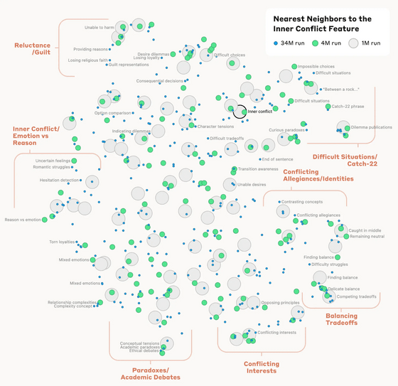 또한 '내부 갈등(Inner Conflict)'의 개념 근처에는 '관계의 파탄', '대립하는 충성심', '논리적 모순' 외에 피할 수 없는 딜레마가 등장하는 소설 'Catch-22'등의 개념이 등장하고 있습니다. AI 모델의 개념 내부 구성은 인간이 생각하는 '유사성'과 어느 정도 대응하고 있으며, Claude의 뛰어난 유추 능력과 비유 능력의 증거일 가능성이 있다고 말해지고 있습니다.