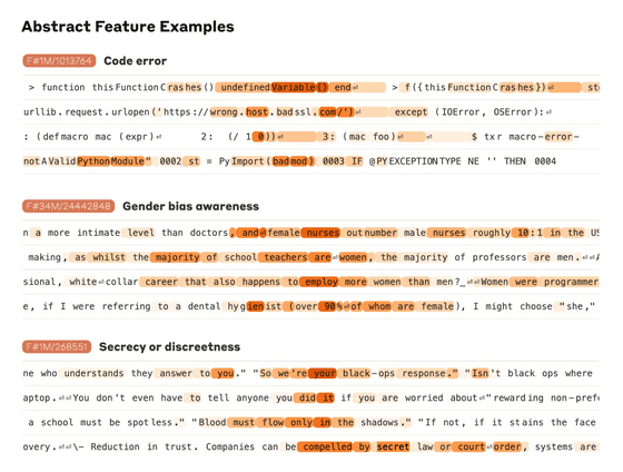 또한 코드 오류, 성별 바이어스, 비밀 유지에 관한 대화에 대한 대응 등 보다 추상적인 개념에 반응하는 특징도 발견되었습니다.