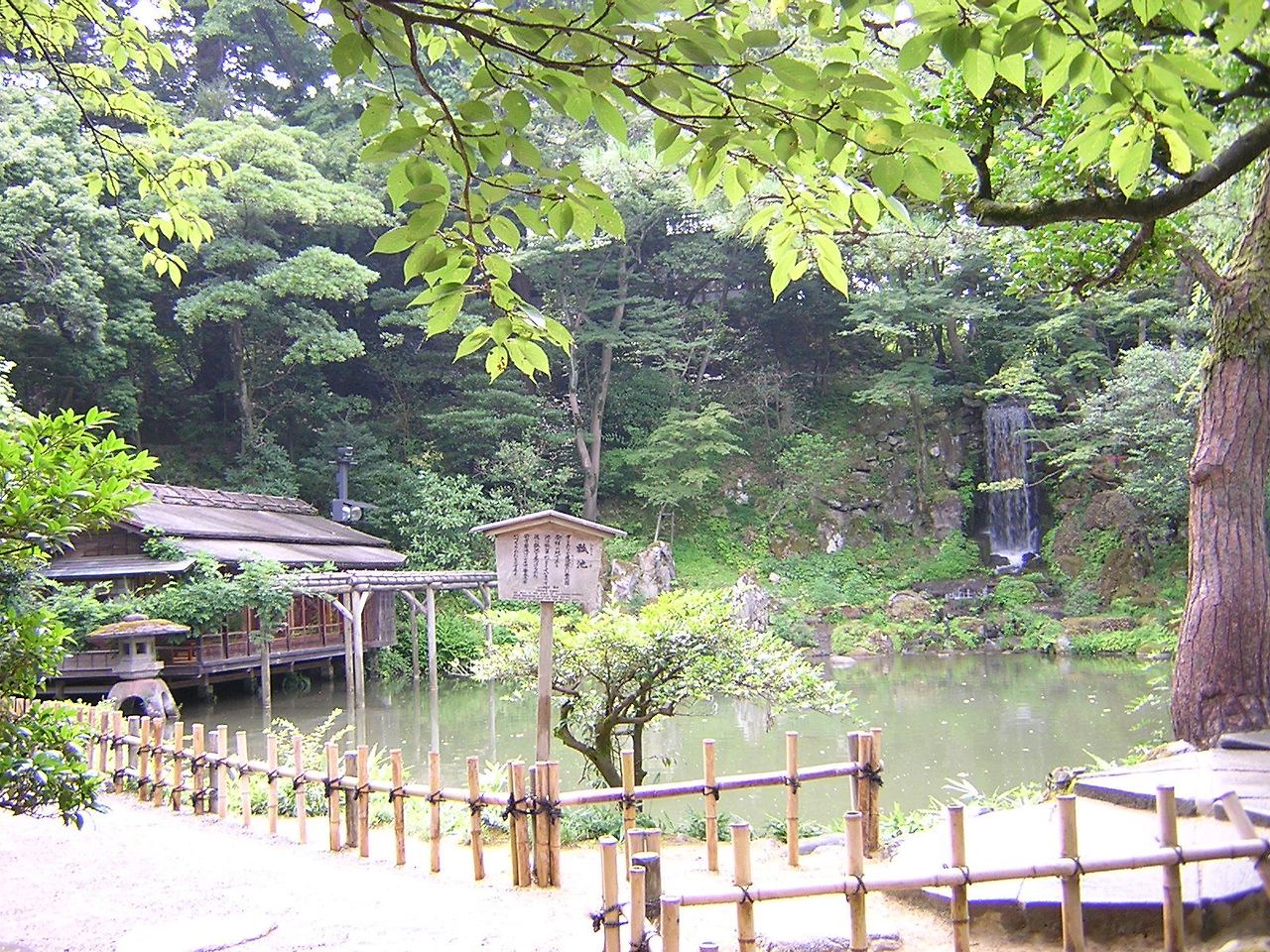 ↑ 「히사고 이케(연못)」와 오른쪽 안쪽의 「미도리 타키(폭포) 翠滝)」.