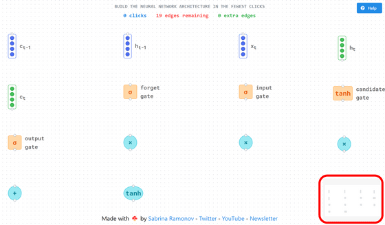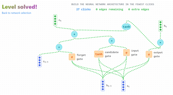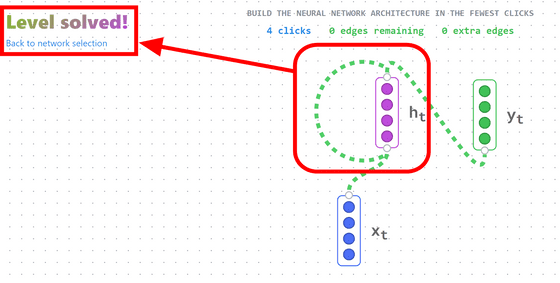 그러고 보니 RNN인데 h_[t-1]가 없네... 라고 생각했습니다만, 잘 생각해 보면 「h_t」 의 출력을 입력에 연결하면 표현할 수 있었던 것이었습니다. 올바르게 모두 연결하면 "Level solved!"라고 표시됩니다. Back to network selection을 클릭하여 Top 페이지로 돌아갑니다.