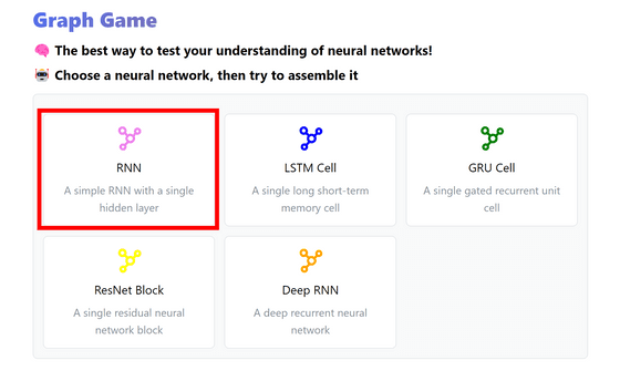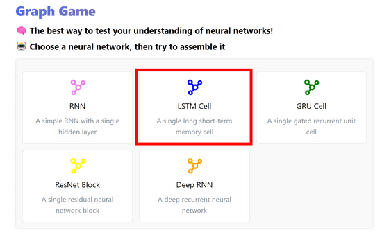 https://graphgame.sabrina.dev/ 사이트에 액세스 하면 이런 느낌입니다. 'RNN', 'LSTM Cell', 'GRU Cell', 'ResNet Block', 'Deep RNN' 등 5개의 스테이지가 준비되어 있습니다.