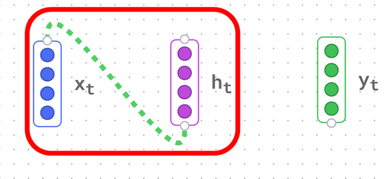 녹색 선으로 연결이 표시되었습니다. 덧붙여 「x_t」, 「h_t」, 「y_t」 가 각각 무엇인가는 전혀 설명이 없습니다만, 이러한 구조의 일반적인 문자의 사용법으로부터 보면 「x_t」 가 입력층, 「h_t」 가 은닉층, 「y_t」 는 출력층일 것입니다.