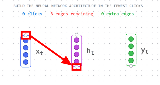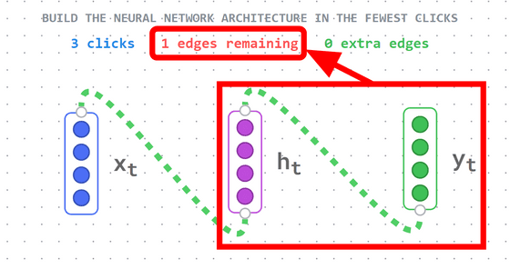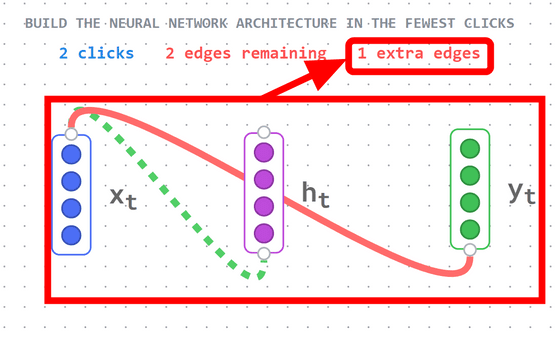 「x_t」 에서 「y_t」 쪽으로 연결해 보면 이번에는 빨간색 선으로 연결되었습니다. 이것은 연결이 잘못되었음을 의미하며, 화면 상단에 "1 extra edges"(여분의 연결이 하나 있습니다)로 표시됩니다. 빨간색 선 연결을 다시 클릭하면 연결을 끊을 수 있습니다.