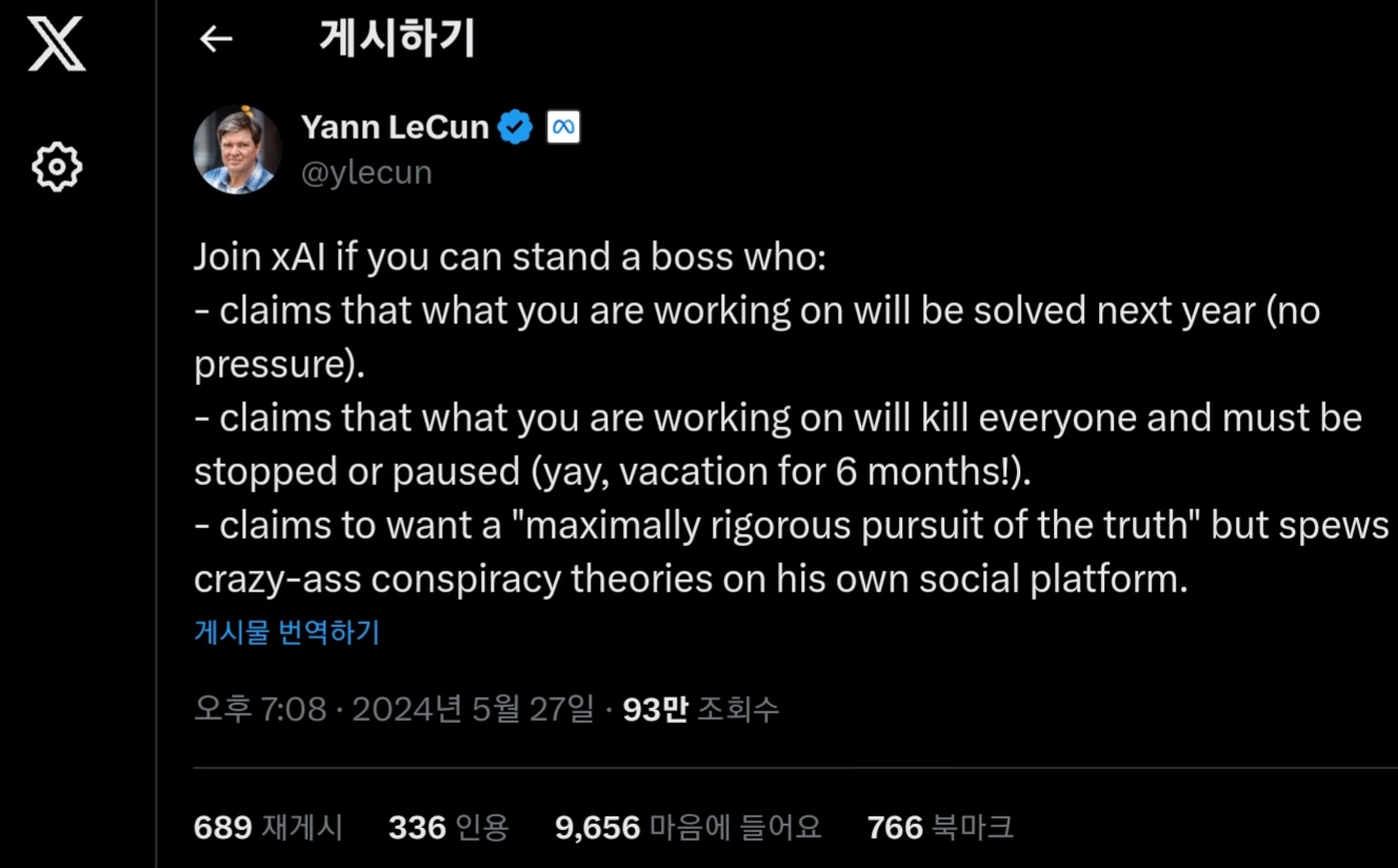 한편, 컨벌루션 신경망의 발명자로 알려진 AI 연구자 얀 르쿤은, xAI에서 일하기 위해서는
